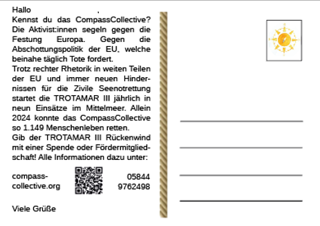 Sende diese Postkarte an Freund*innen, Bekannte oder Familienmitglieder und bitte sie unsere Arbeit zu unterstützen.